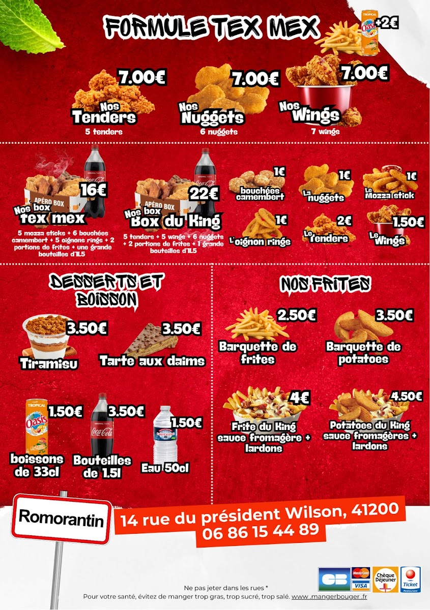 Tacos King is a popular brand located at 14 Rue Du Président Wilson in Romorantin-Lanthenay, EMEA 41200. Known for their delicious tacos and wraps, Tacos King offers a variety of menu options to choose from. The Menu tacos King includes 4 tortillas, 4 viandes et 1 sauce au choix, served with frites à l’intérieur. If you're looking for a tasty wrap, the King wrap with galette de pommes de terre, tenders, Cheddar et crudités is a must-try.