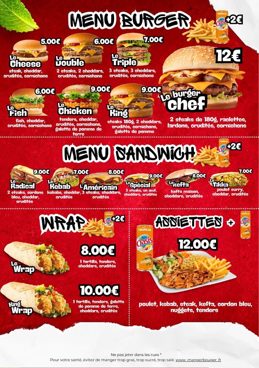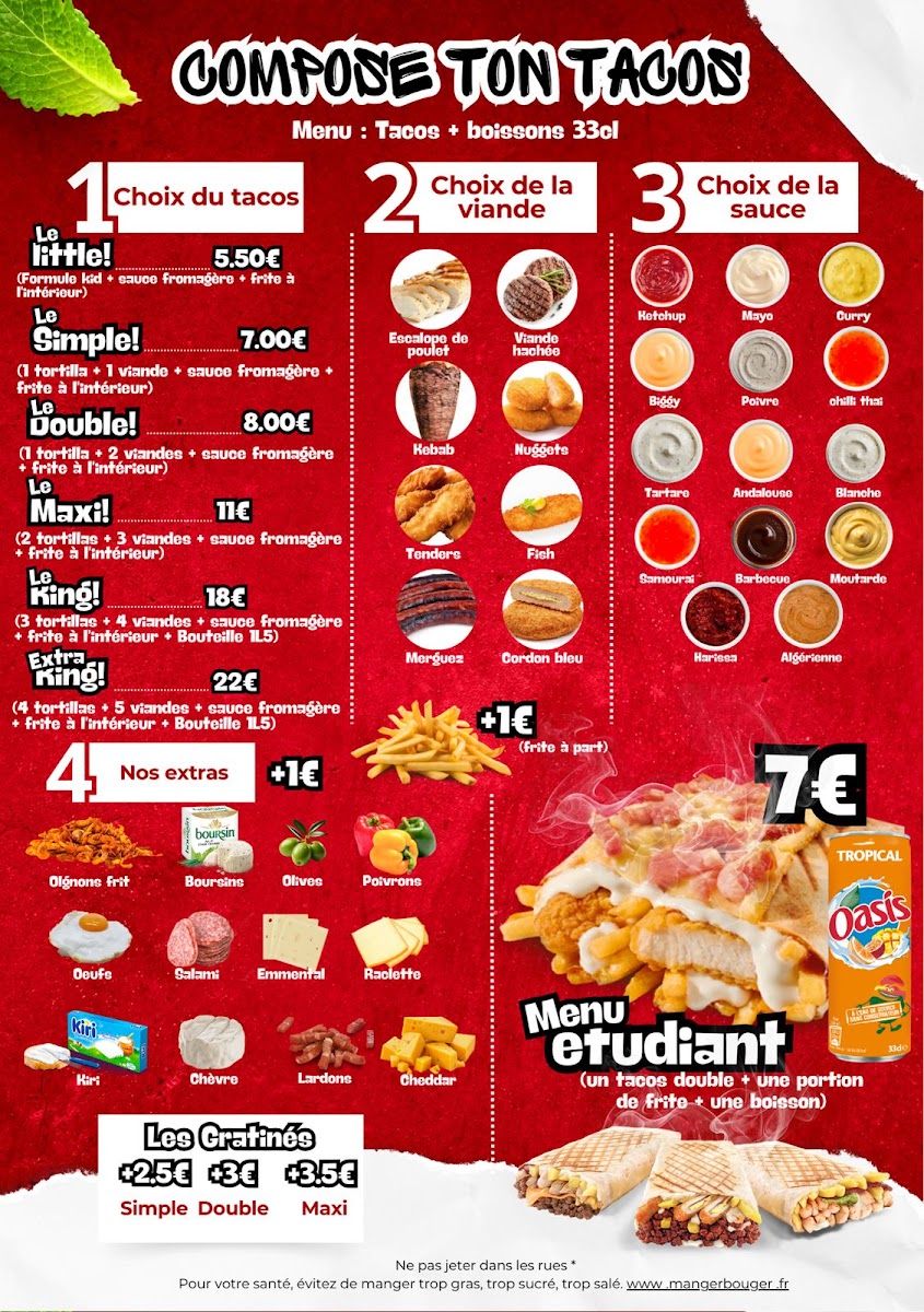 For those on a budget, the Menu étudiant offers a great deal with 1 tacos King double served with 1 boisson 33 cl au choix. And don't forget about the little ones, as Tacos King also has a Menu tacos little for kids with viande et sauce au choix served with frites à l’intérieur.